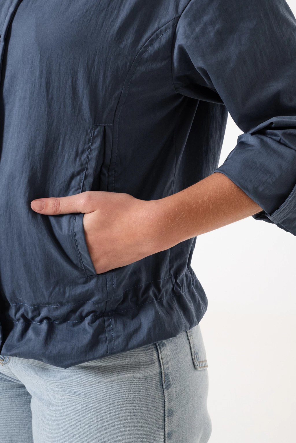 Esta chaqueta fluida está confeccionada en poplin esmerilado liviano, una tela que combina suavidad y frescura, . La forrería de tafeta aporta un acabado delicado y agradable al contacto con la piel.